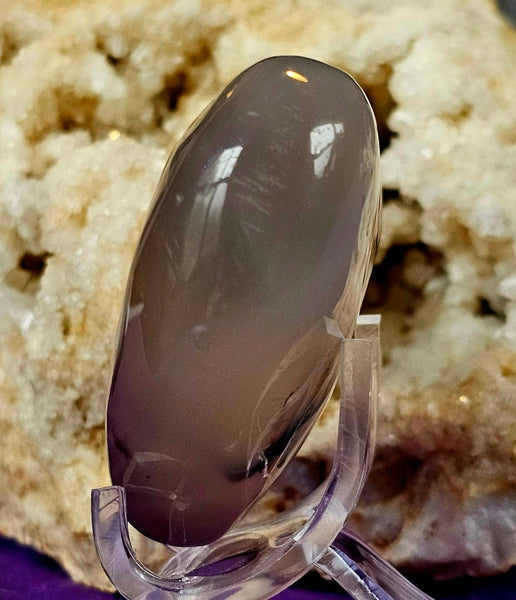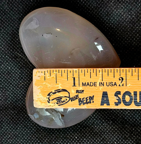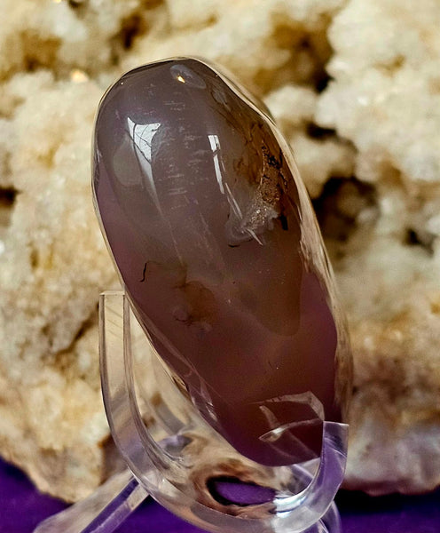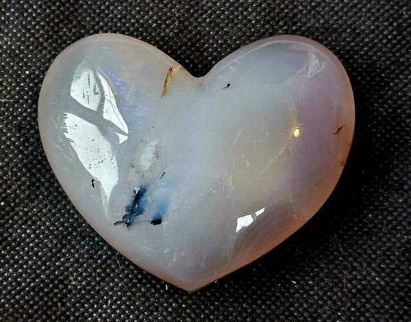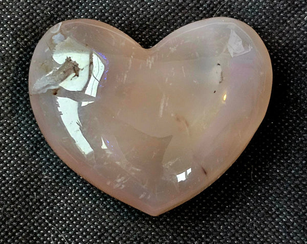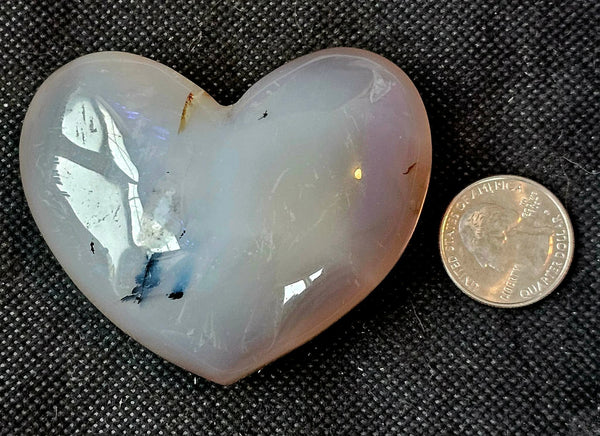 Smooth heart-shaped agate crystal. Has a pretty grayish-purple color with some natural inclusions. Polished and feels nice to hold. Good for decor or as a gift. Size is shown next to a quarter for reference.๐KRH