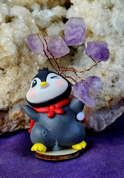 Happy Penguin in Cape w/Wire Wrapped Amethyst Crystal Tree 🌳🐧💜