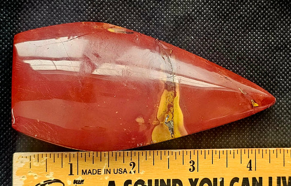 Gorgeous red and yellow polished Mookaite Jasper Crystal Freeform. Has cool yellow and orange patterns throughout. Tear drop shape, pointy at top. Looks super shiny and smooth, great for display or crystal collection.