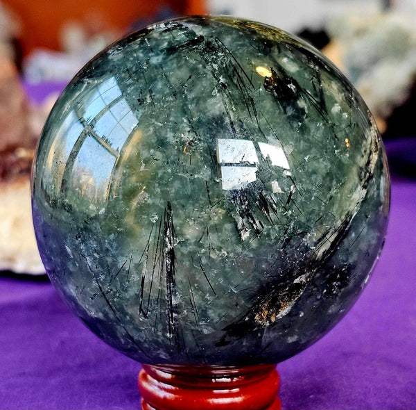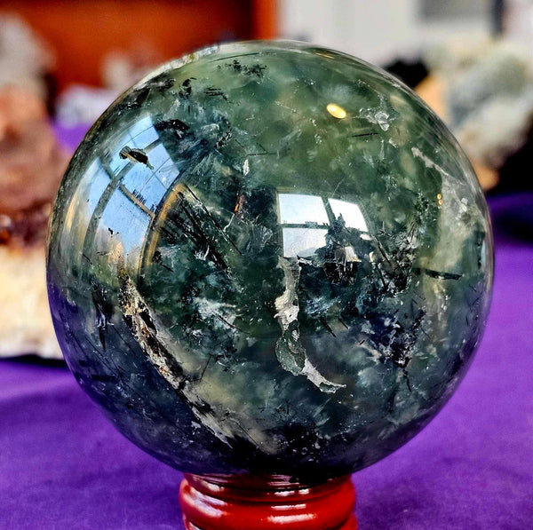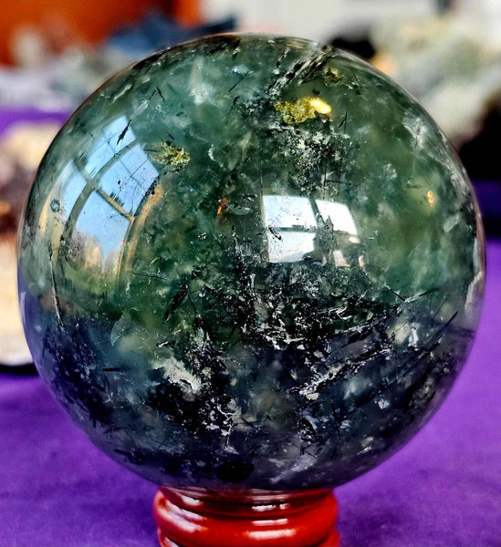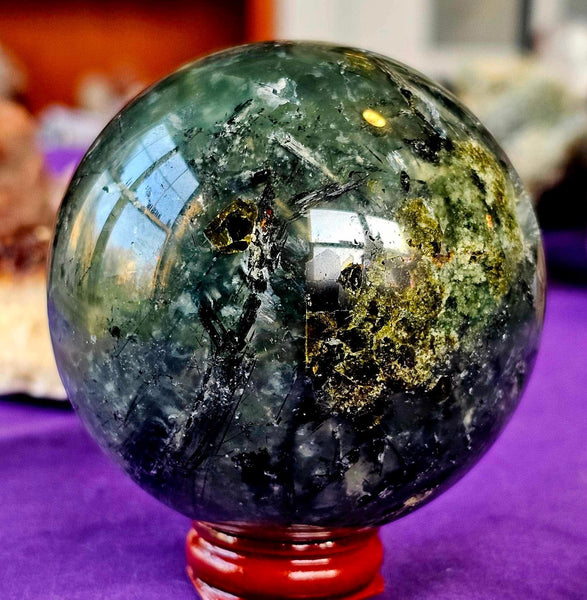 Sphere is 70 MM in diameter. Specimen contains bugs, black tourmaline and green epidote inclusions. 😀KRH