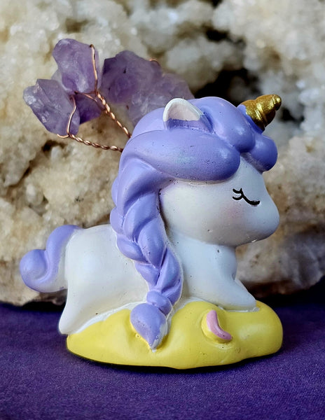 Sleeping Unicorn on Yellow Cloud w/Wire Wrapped Amethyst Crystal Tree ✨🌳💜🦄💛☁️