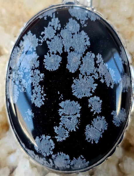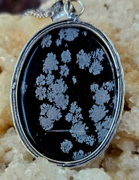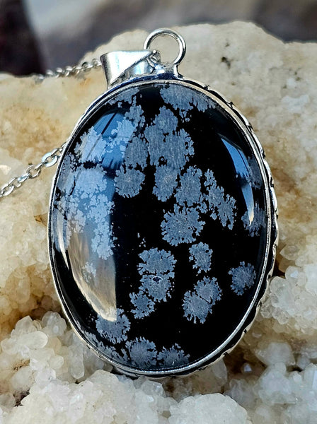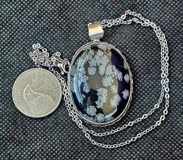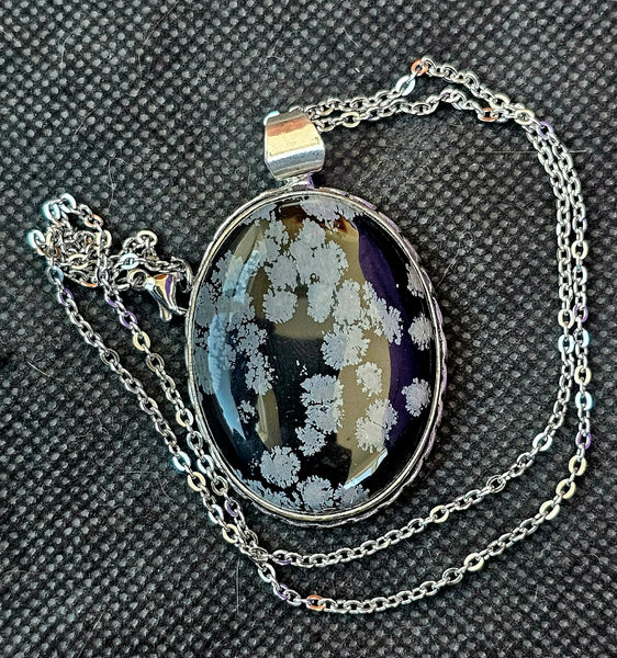Unique snowflake obsidian pendant. Black stone has cool white patterns. Silver-tone setting and comes with a chain.